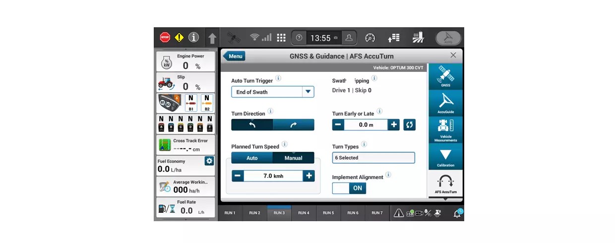 AFS AccuTurn™ works with AFS AccuGuide™ to provide hands-free steering for automatic, repeatable end-of row turns — maximising a vehicle’s turning accuracy and overall efficiency.